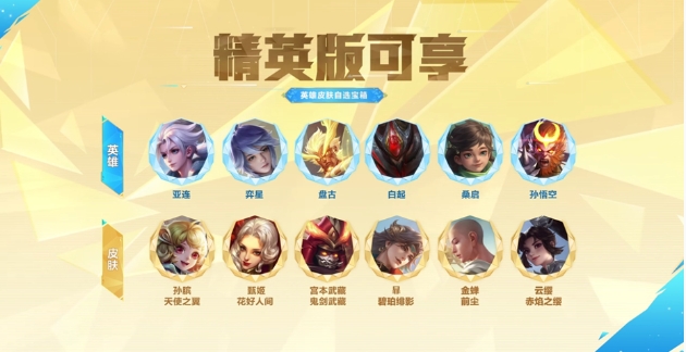 皮肤(六选一):孙膑-天使之翼、甄姬-花好人间、宫本武藏-鬼剑武藏、暃-碧珀绯影、金蝉-前尘、云缨-赤焰之缨。