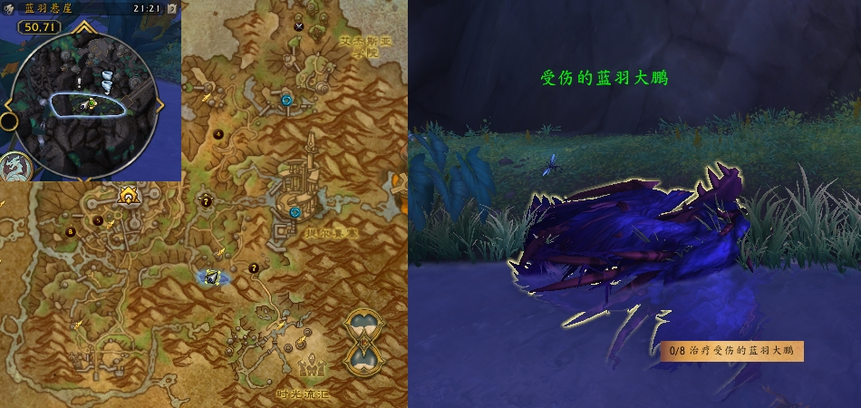 任务需求:接取任务后,前往(蓝羽悬崖 50,71)处,治疗8个 “受伤的蓝羽大鹏”。