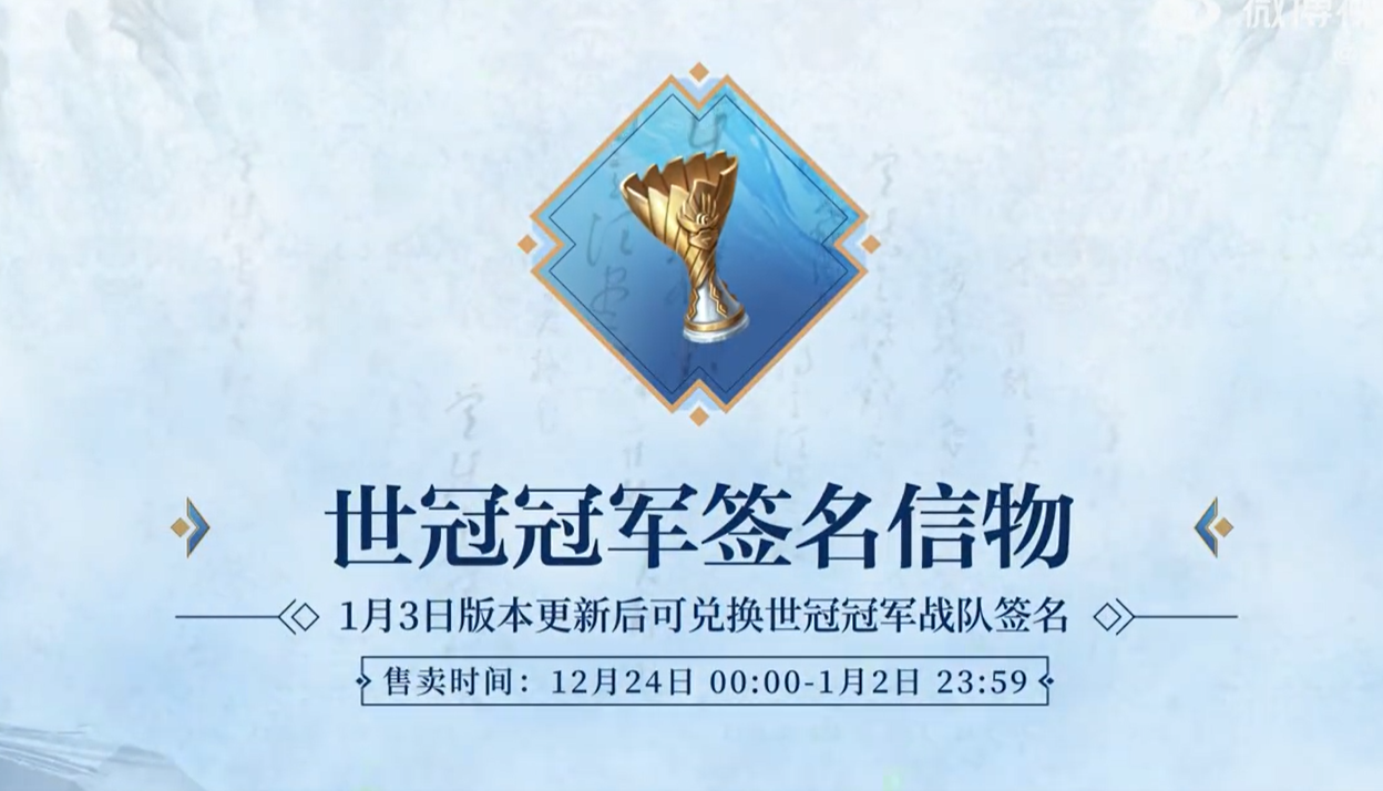 世冠冠军签名信物:1月3日版本更新后可兑换本届世冠冠军战队签名