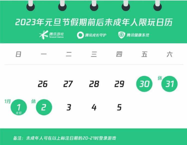 1、未成年玩家在2023年元旦假期期间,12月30-31日,1月1-2日期间,每天的20:00-21:00可以登录游戏并进行对局;