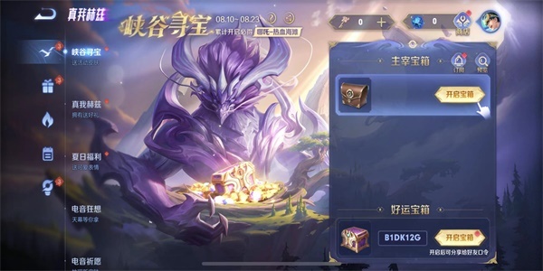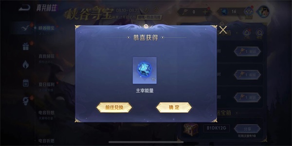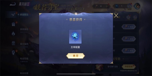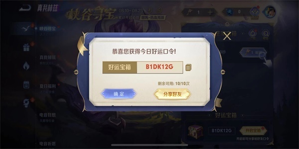 2、接着找到峡谷寻宝活动,就可以获得到今日好运口令,可以使用钥匙打开一个宝箱,打开之后我们就可以获得到1个主宰能量。