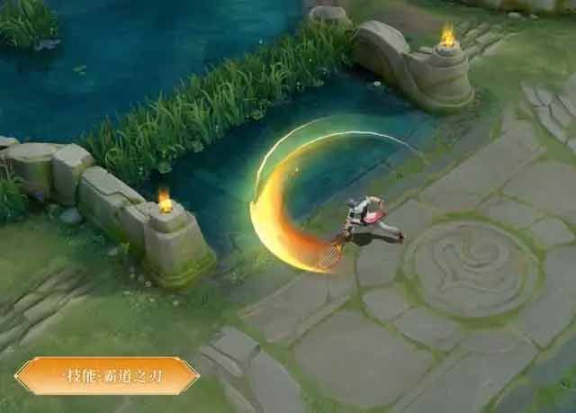 一技能·霸道之刃,曹操在释放一技能的时候,前面两次会向前面挥出一道黄色的剑气,第三次强化普攻会向前方挥出一刀,同时目标处还会出现地面裂开的效果。