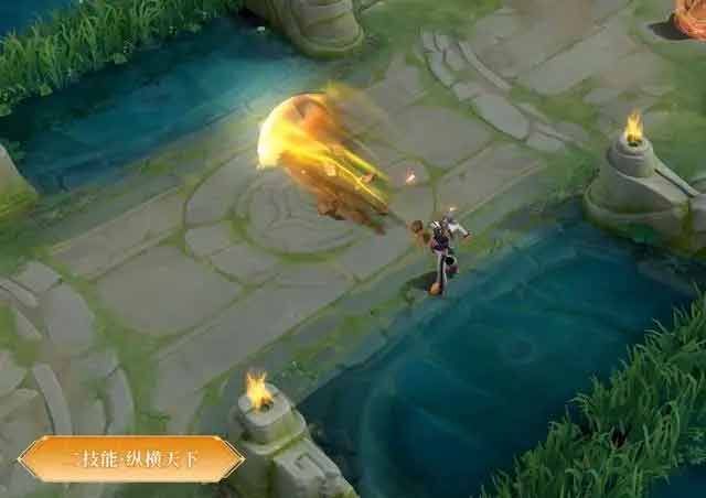 二技能·纵横天下,曹操在释放二技能的时候,也会向前挥出一道剑气,同时伴有黄色和棕色的效果,随后消散,同时地面也会有石块向两面飞出。