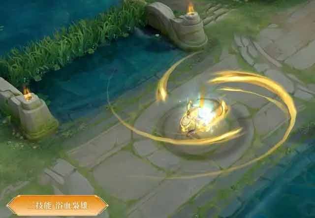 三技能·浴血枭雄,曹操在释放三技能的时候,会有黄色的能量旋转汇聚到曹操身上,随后曹操的身上和网球拍上面都会有黄色的火焰特效,而后他的攻击也都会有强化效果。
