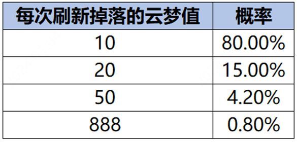 云梦值:每次成功刷新奖励时,会获得云梦值(10,20,50或888)。积累云梦值可以提高云梦值等级,最高4级。