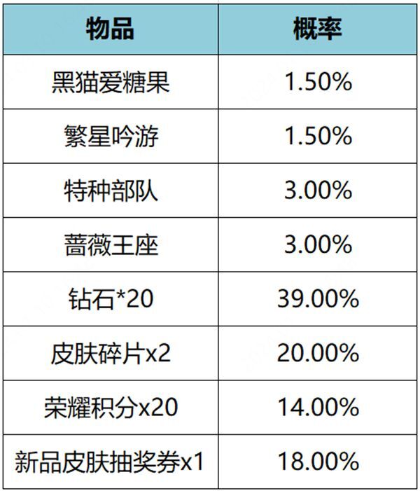 购买礼包必得红蓝对决(1日),可额外随机获得以下之一:繁星吟游、黑猫爱糖果、蔷薇王座、特种部队、皮肤碎片*2、荣耀积分*20、新品皮肤抽奖券*1、钻石*20。累计100次必得繁星吟游和黑猫爱糖果。