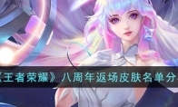 王者荣耀即将迎来八周年庆典,那么八周年返场皮肤名单有哪些呢?相信还有不少游戏玩家不清楚,今天小编就给大家带来了八周年返场皮肤名单一览,有兴趣的小伙伴一起来看看吧。 王者荣耀八周年返场皮肤名单有哪些第一名:鲁班七号【寅虎瑞焰】价格:1788点卷 第二名:马可波罗【深海之息】售价:1788点卷 第三名:公孙离【祈雪灵祝】售价:1788点券 第四—六名(三选一进行返场):韩信【傲雪梅枪】售价:888点卷 妲己【时之奇旅】售价:888点卷 王昭君【星穹之声】售价:1788点卷 以上就是3DM小编整理带来的《王者荣耀》八周年返场皮肤名单分享,更多相关游戏攻略,请关注3DM手游网!
