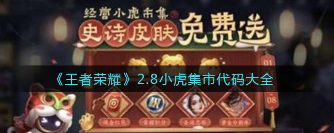 《王者荣耀》游戏中小虎集市玩法已经上线了,很多玩家想知道2月8号小虎集市代码有哪些,那么今天小编就给大家介绍一下王者荣耀2.8小虎集市代码大全,有需要的小伙伴不要错过了。 《王者荣耀》2.8小虎集市代码大全1.【王者荣耀】末日机甲SSH488【我的小虎糕今天670块】2.【王者荣耀】地狱火49ODIS【我的小虎糕今天800块】3.【王者荣耀】狄仁杰RID1MK【我的小虎糕今天685块】4.【王者荣耀】李白AV9R55【我的小虎糕今天608块】5.【王者荣耀】龙骑士W5RLAL【我的小虎糕今天734块】6.【王者荣耀】猫狗日记I3FIJZ【我的小虎糕今天840块】7.【王者荣耀】千年之狐72BUAI【我的小虎糕今天466块】8.【王者荣耀】圣诞狂欢1MG9VC【我的小虎糕今天839块】9.【王者荣耀】天才门将UL